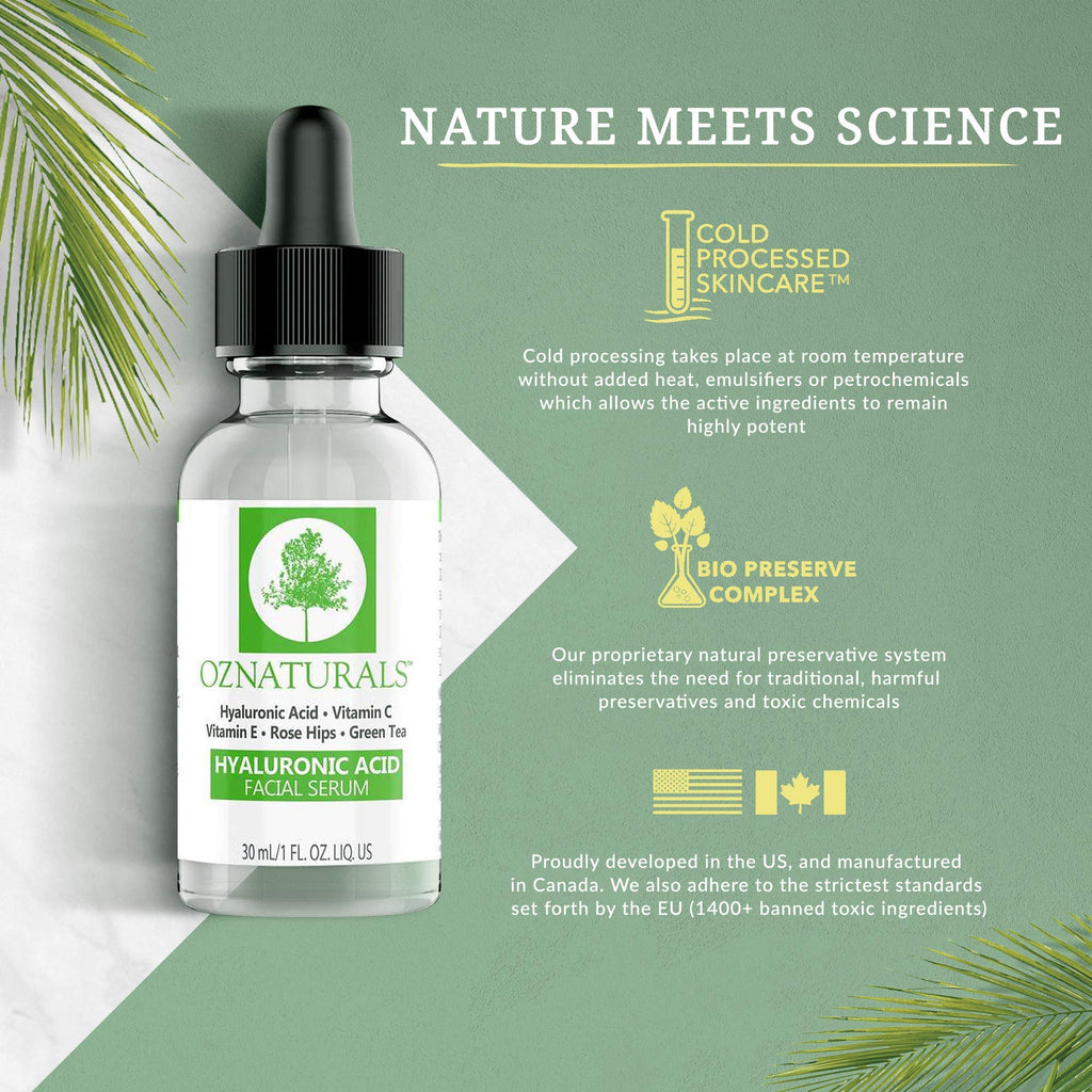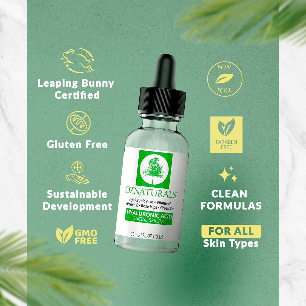 OZNaturals Hyaluronic Acid Serum with Rose Hips Extract, Astaxanthin, Green Tea, Vitamin E, and Vitamin E - Anti-Aging Serum for Plump, Hydrated, Wrinkle Free Skin - Cold-Processed For Potency
