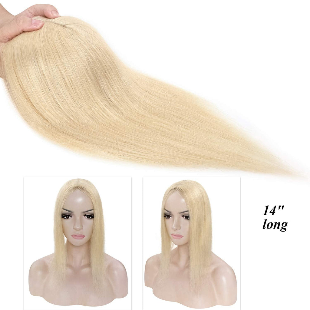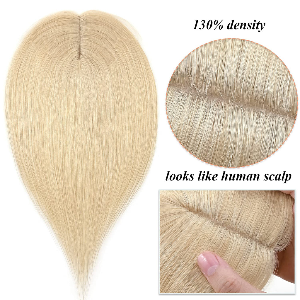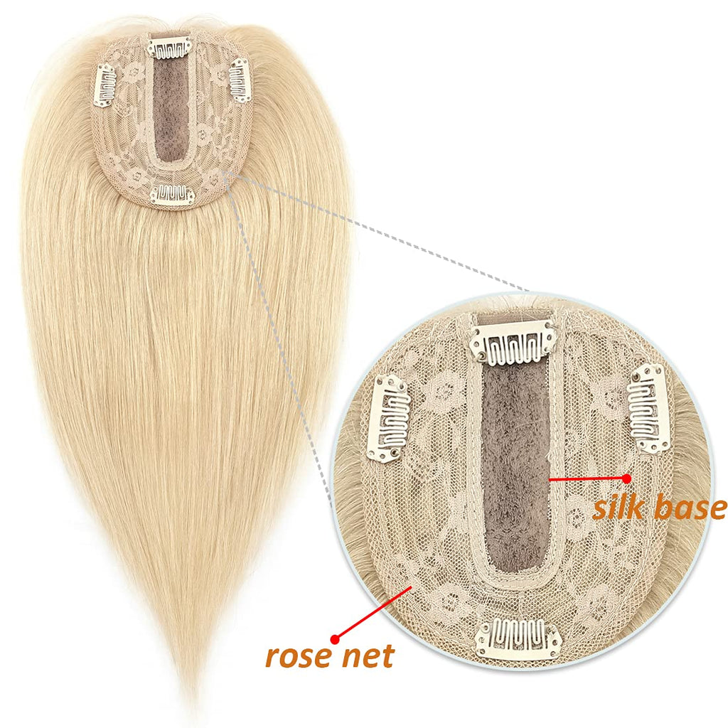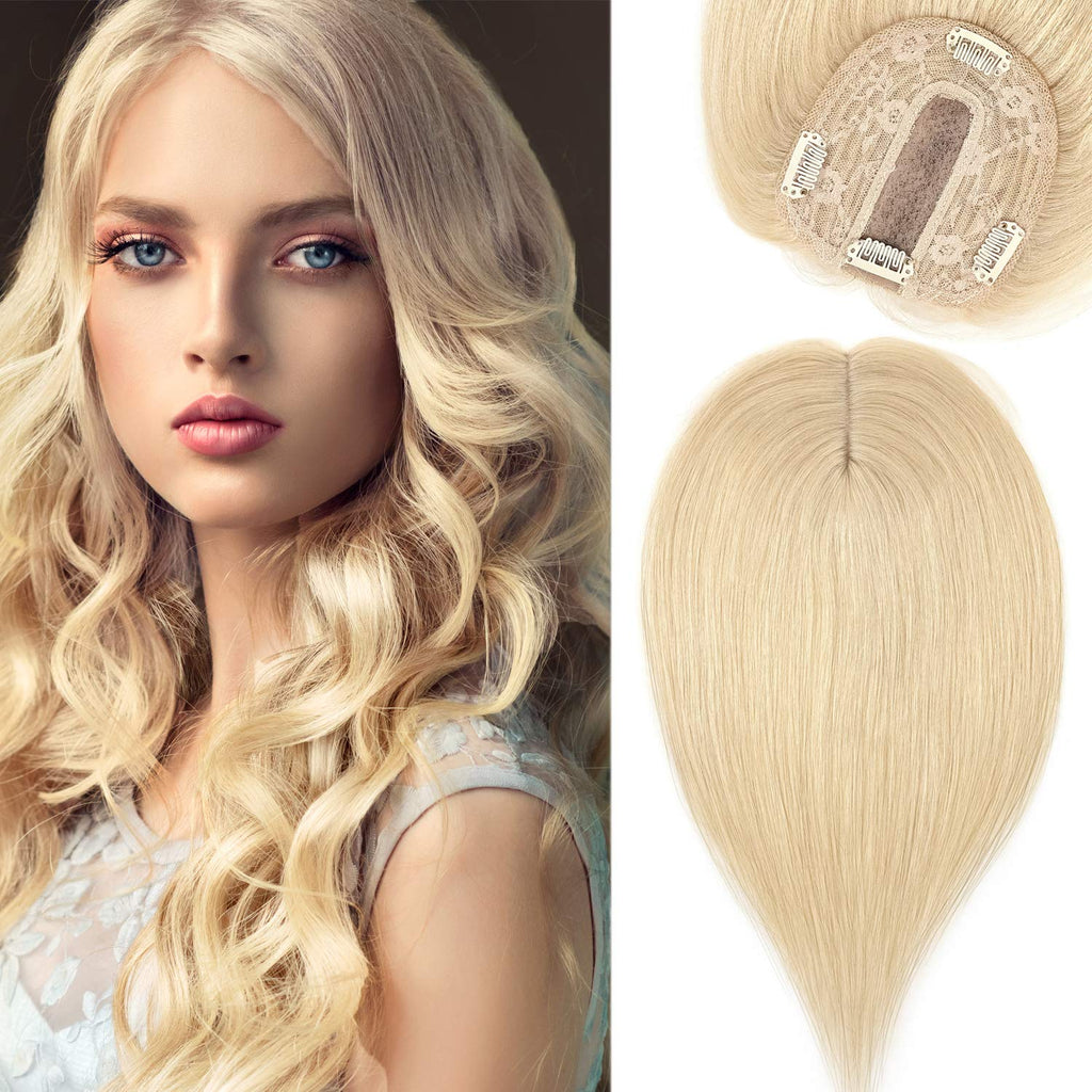 S-noilite Silk Base Topper Human Hair Piece Clip in Crown Toupee Top Hair Extensions Silk Topper for Women Replacement for Slight Hair Loss Thinning Hair 130% Density (16"-50g,#613 Bleach Blonde)