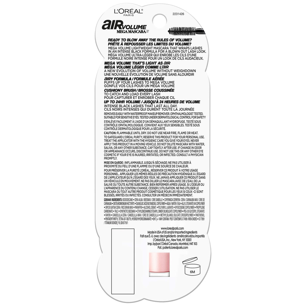 L'Oreal Paris Air Volume Mega Mascara, Lightweight Mega Volume Washable, WATERPROOF Blackest Black, 0.3 fl. oz.