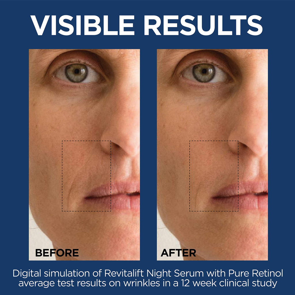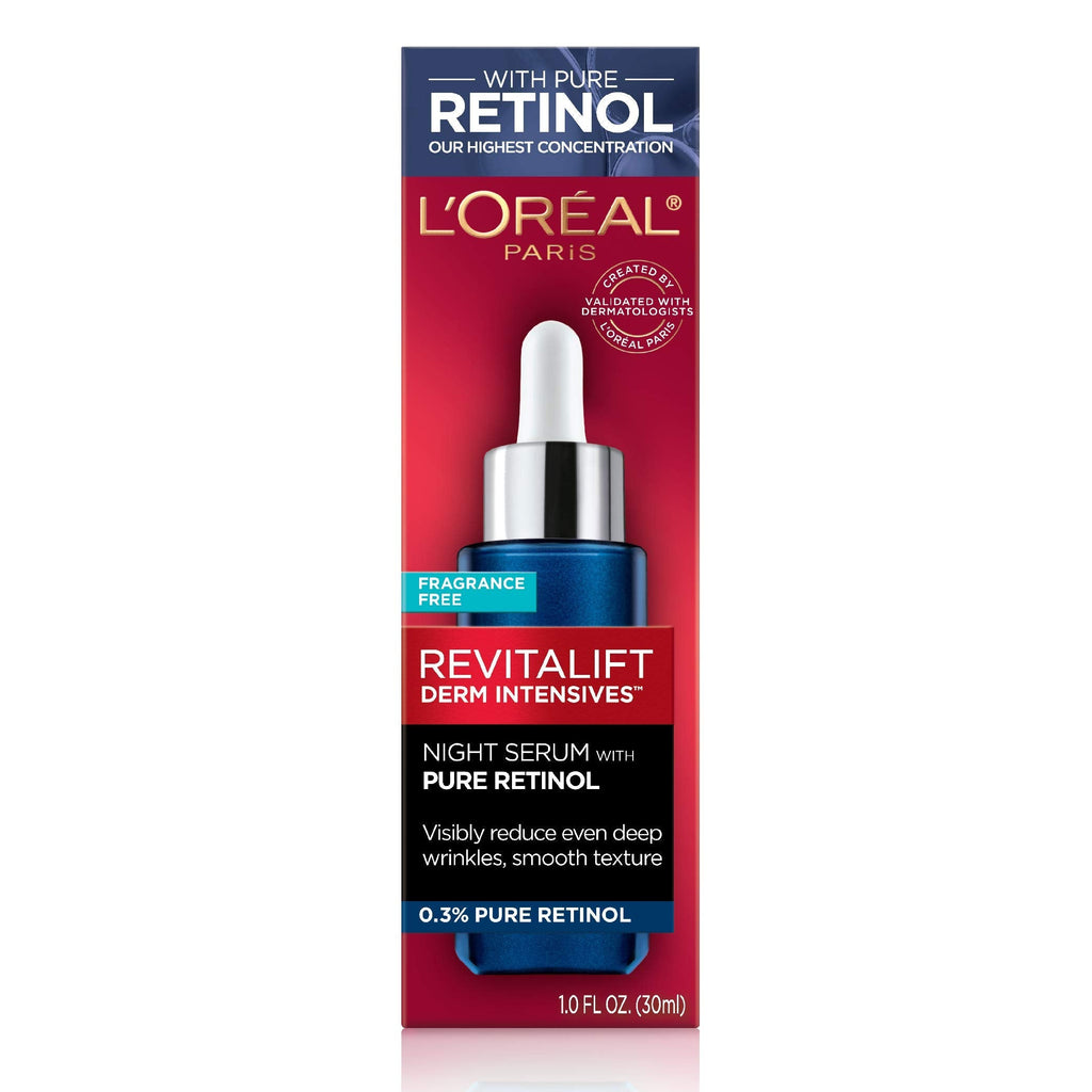 L'Oreal Paris Retinol Serum for Face, Night Serum 0.3% Pure Retinol from Revitalift Derm Intensives, Visibly Reduce Wrinkles, Even Deep Ones, 1 Oz Serum + Moisturizer Cream Samples, Packaging May Vary