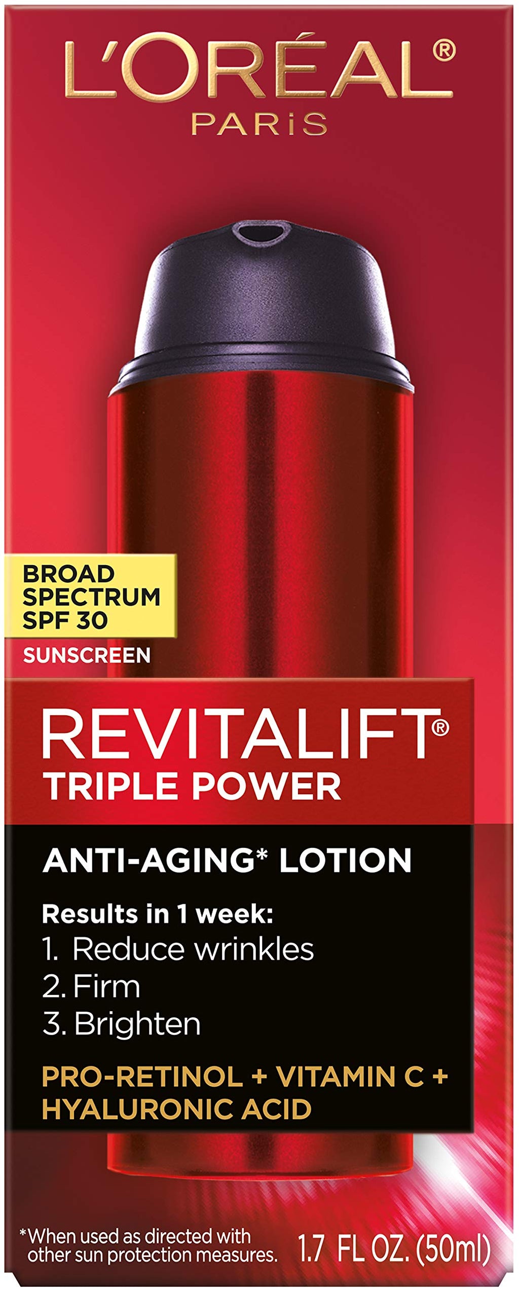 L'Oreal Paris Skincare RevitaliftTriple Power Broad Spectrum SPF 30 Sunscreen, Face Moisturizer with Pro-Retinol, Vitamin C, and Hyaluronic Acid to Reduce Wrinkles, Firm and Brighten Skin, 1.7 Oz.