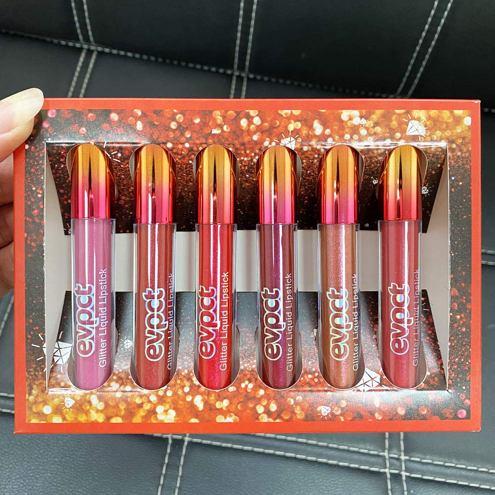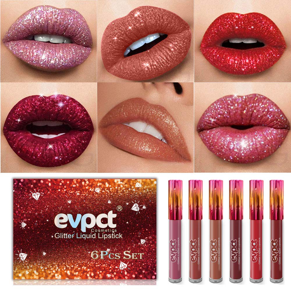 evpct 6Pcs Matte to Glitter Liquid Lipstick Long Lasting Lips Set Kit,6 Colors Diamond Red Glitter Sparkly Glossy Waterproof Lipstick Metallic Shimmer Brown Pink Lipgloss Lip Gloss Sets for Women