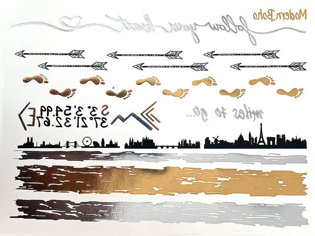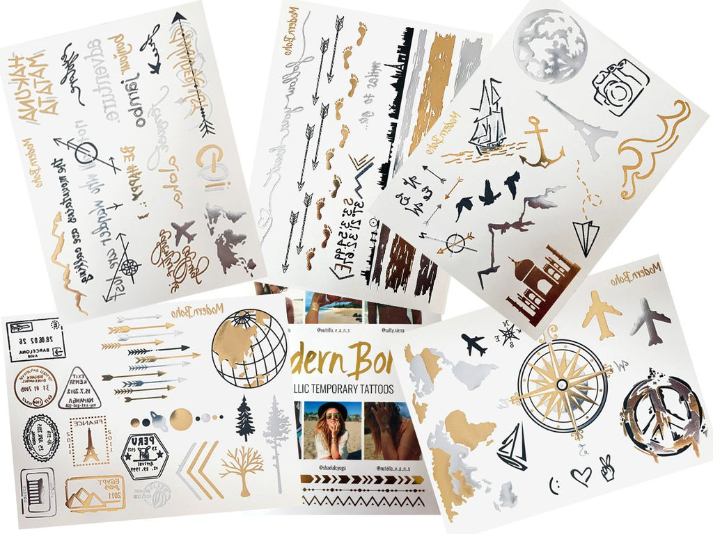 Modern Boho 5 Sheets Metallic Tattoos, Gold/Silver Flash, Wanderlust Collection