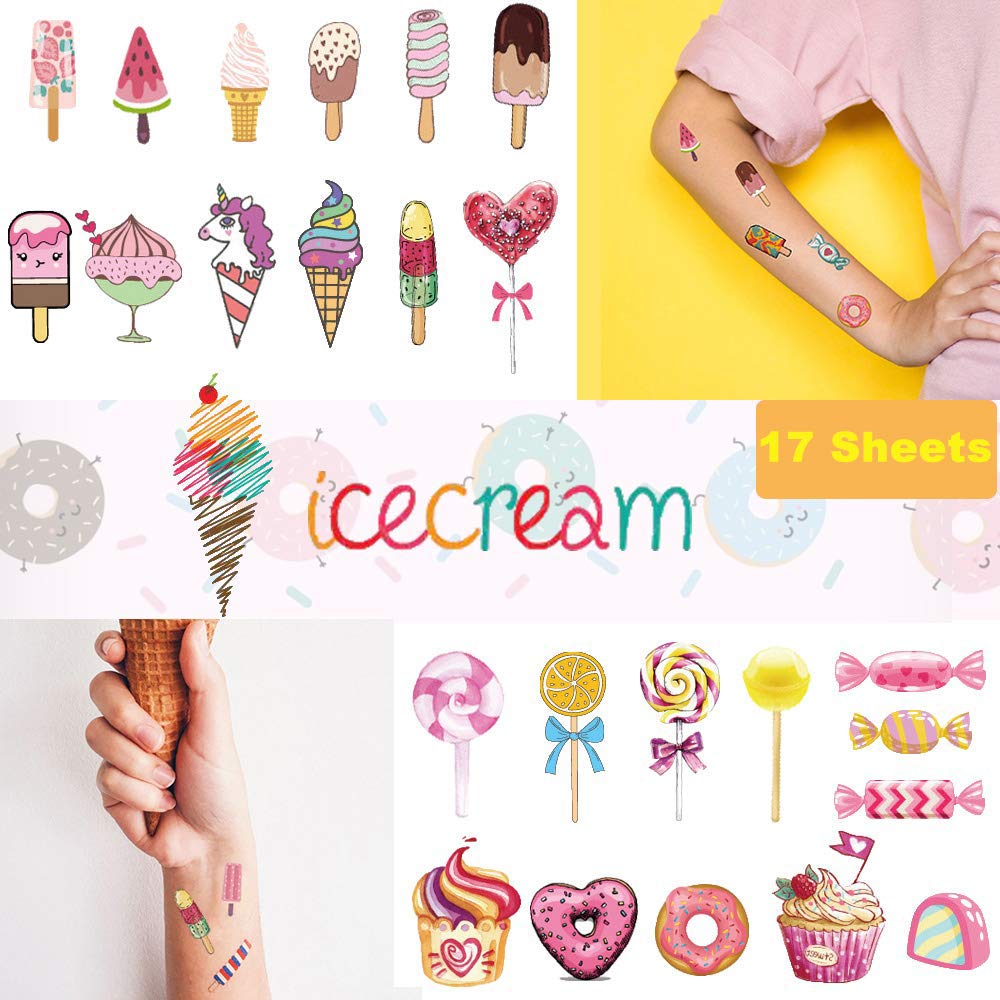 Ooopsi Ice Cream Temporary Tattoos for Kids 180PCS - Ice Cream, Lollies, Cookie, Cake Tattoo Stickers - Sweet Summer Tattoos Sticker for Girl Birthday Party Decorations Supplies Favors(17 Sheets)