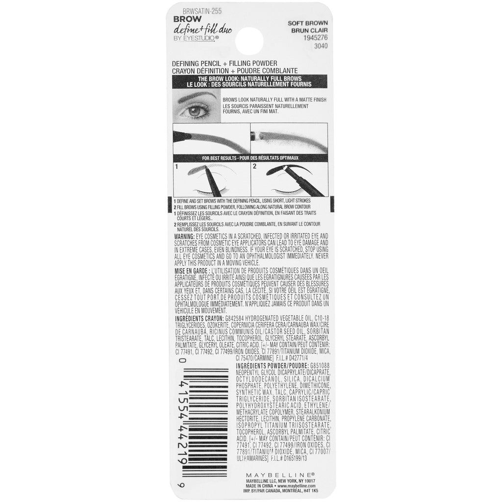 Maybelline Brow Define and Fill Duo 2-in-1 Defining Pencil with Filling Powder, Soft Brown, 0.021 Ounce