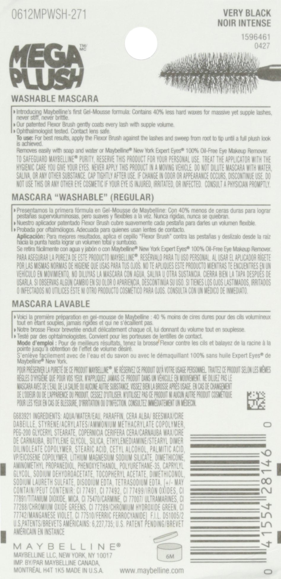 Maybelline New York Volume Express Mega Plush Washable Mascara, Very Black, 0.3 Fluid Ounce