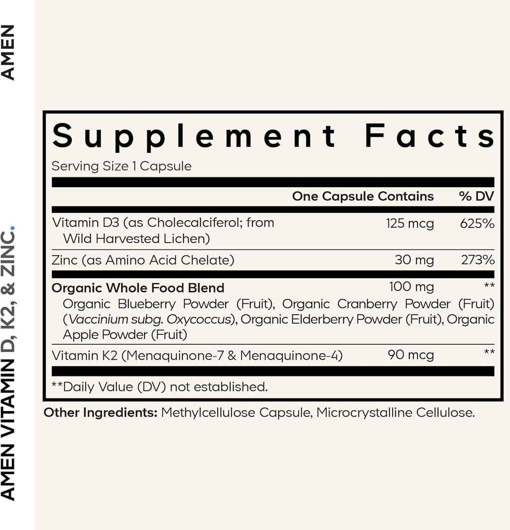 Amen Vitamin D, K2 & Zinc, Cholecalciferol D3 5000 IU, Organic Whole Food Blend with Apple, Blueberry, Cranberry, Elderberry Powder Fruits, Vegan Supplement, D3 K2 Vitamins, Non-GMO - 60 Capsules