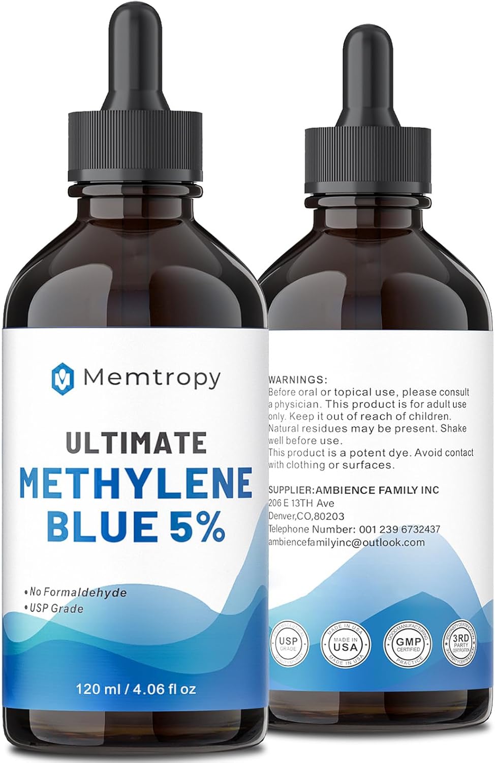 Methylene Blue Pharmaceutical Grade 4.06 fl oz (120 mL), 99% Purity Supplement for Humans, Formaldehyde-Free, Alcohol-Free, Glass Bottle
