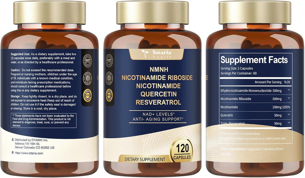 NMNH (Dihydronicotinamide Mononucleotide), NMN Alternative Supplement w/Niacinamide (Vitamin B3), Quercetin, Trans-Resveratrol, Support NAD+, Skin Cell Health*, Anti-Aging & Energy, 120 Caps