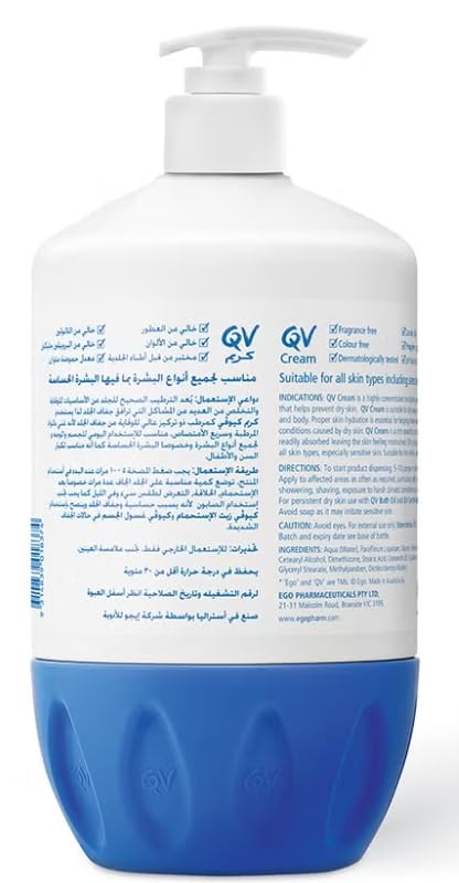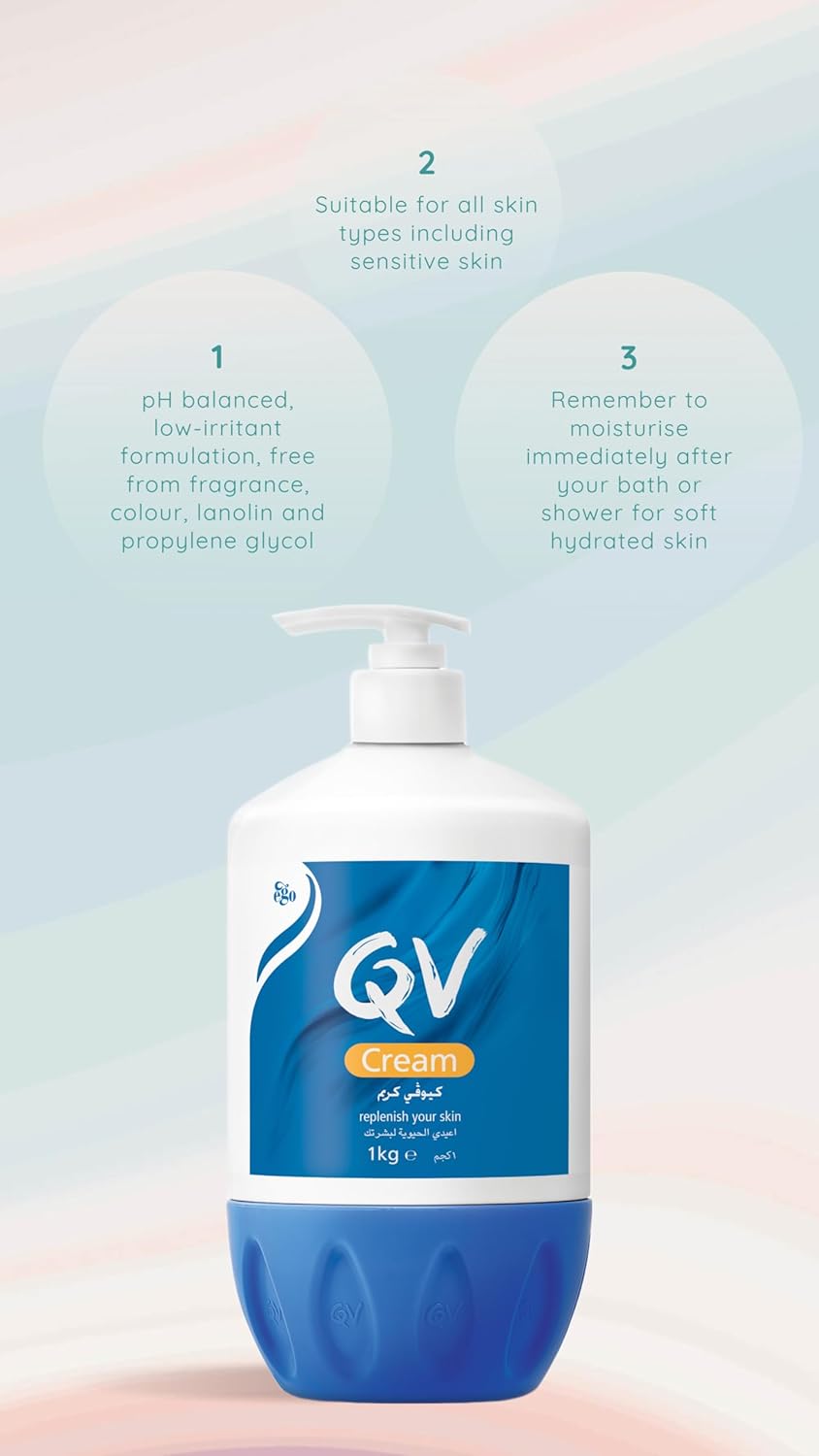 QV Cream with 10% Glycerin (1050g) Rich Protective Moisturiser for Sensitive, Dry Skin, Fragrance Free, Noncomedogenic Body Cream, Hydrating Skin Care for Eczema, Psoriasis, Dermatitis, Pump Bottle