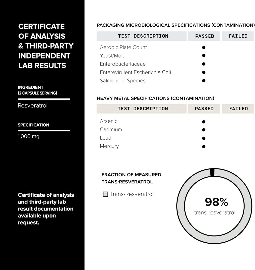 Ultra High Potency Third-Party Tested Trans Resveratrol 1000mg - 98% Pure, Highly Purified and Bioavailable - Resveratrol Polygonum Root Extract - 60 Capsules