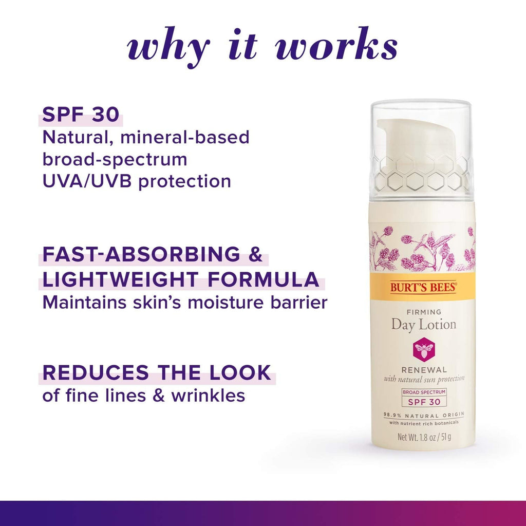 Face Lotion, Burt's Bees Retinol Alternative Facial Moisturizer, Anti-Aging Sunscreen with SPF 30, Firming Day Skin Care, 1.8 Ounce (Packaging May Vary)