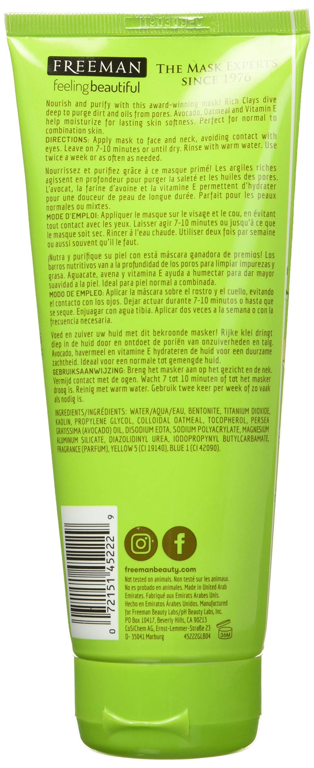 Freeman Purifying Clay Facial Mask, Oil Absorbing and Hydrating Beauty Face Mask with Avocado and Oatmeal, 6 oz