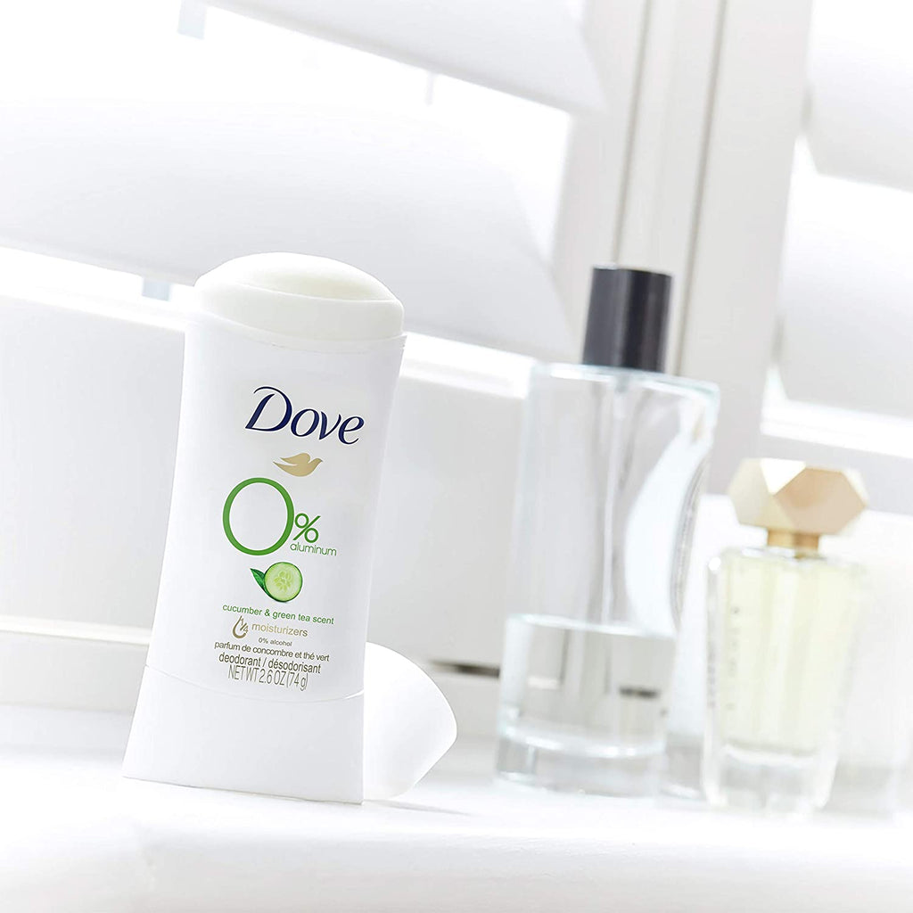 Dove 0% Aluminum Deodorant 24 Hours Odor Protection Cucumber and Green Tea with ¼ Moisturizers and 0% Alcohol 2.6 oz 4 Count