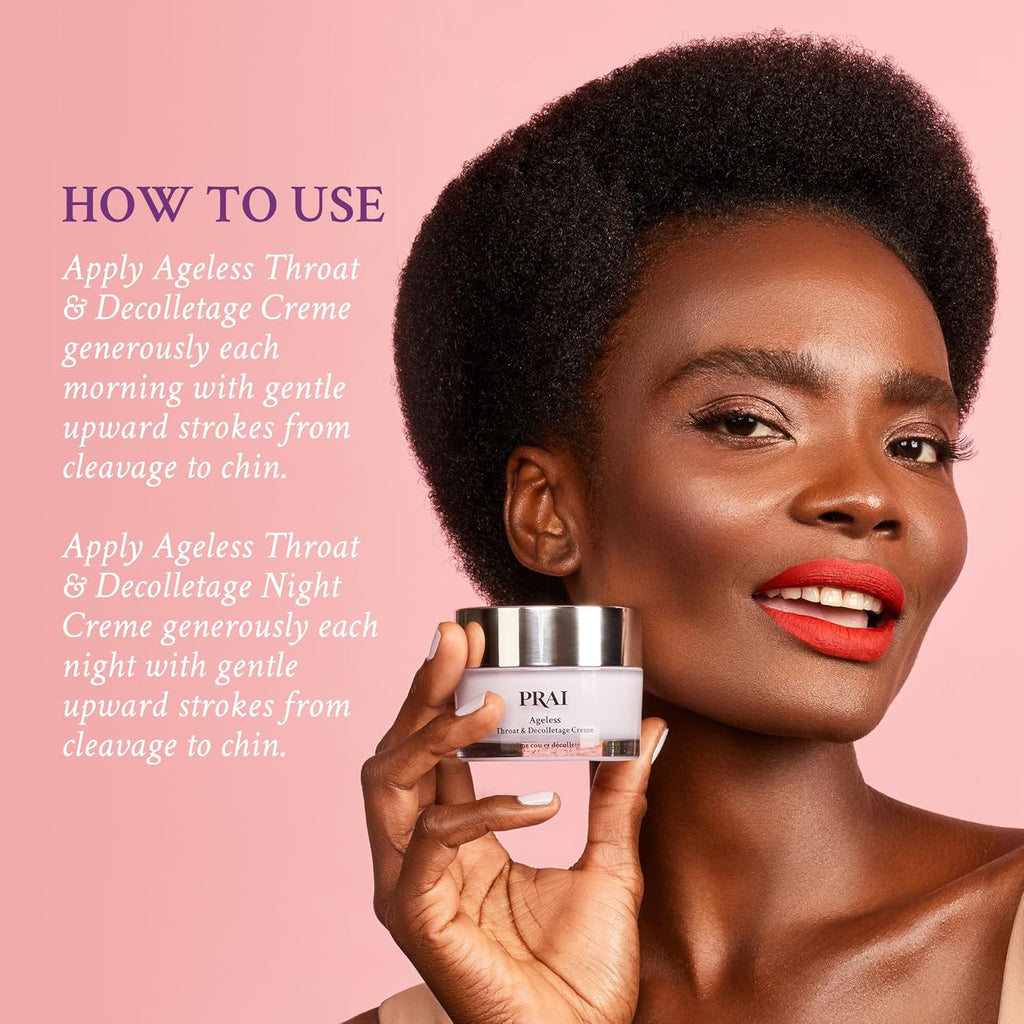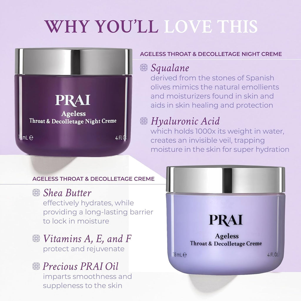 PRAI Beauty Ageless Day and Night Neck Creme Set | 1 Throat & Decolletage Day Creme and 1 Throat & Decolletage Night Creme | Skin Tightening Cream Set for Instantly Ageless Neck | 4.0 Oz Each